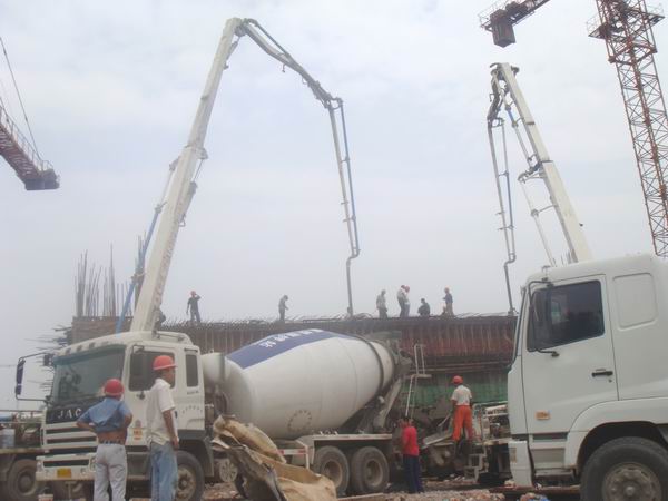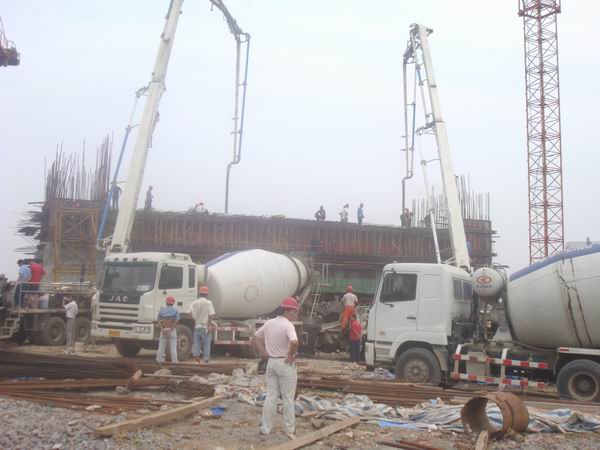 盛夏季節(jié),驕陽似火。經(jīng)項目部科學(xué)組織、精心準備、合理安排,2009年6月21日上午六安市淠望路大橋工地上人頭攢動、機器轟鳴,兩臺混凝土泵車高高聳立在大橋主墩0#塊上面。九時許,經(jīng)現(xiàn)場監(jiān)理組和業(yè)主驗收后,淠望路大橋主墩0#塊開始澆注混凝土,現(xiàn)場施工人員克服高溫酷暑天氣,經(jīng)過個5個多小時的連續(xù)奮戰(zhàn),于當天下午三點順利完成混凝土的澆筑工作。