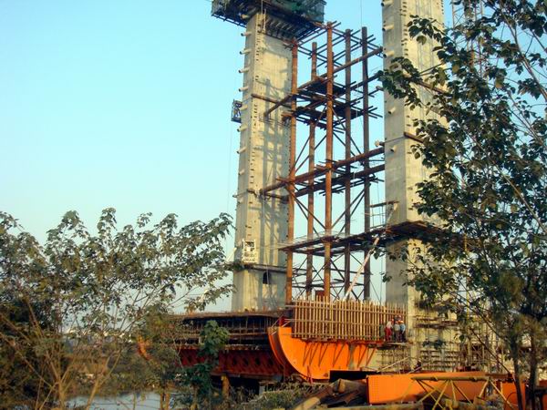 六安淠望路大橋主跨長120米,共有15個節(jié)段,最大節(jié)段長10米,寬35米,重410噸。普通節(jié)段長7米、寬27米、重300噸。由于節(jié)段長、重量大,普通掛籃不能滿足施工要求,按設(shè)計要求采用前支點掛籃,掛籃的前端支點利用斜拉索掛制于索塔。施工過程中前點荷載均由斜拉索承受,澆注混凝土?xí)r,通過調(diào)整索力來調(diào)整掛籃高程。本項目采用的前支點掛籃,掛籃長18米、寬30米、重166噸,此種掛籃施工工藝在公司尚屬首次。