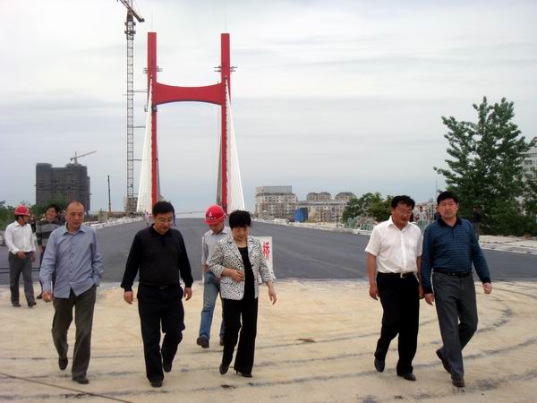 朱紅的索塔雄偉絢麗,扇狀的斜拉索似一雙巨大而潔白的羽翼,剛攤鋪好瀝青的橋面黑亮寬敞而又整潔順暢……遠(yuǎn)遠(yuǎn)望去整個(gè)大橋氣勢(shì)恢宏、身姿優(yōu)美,似長(zhǎng)龍橫臥,如彩虹飛架,在藍(lán)天白云、碧波綠水的映襯下顯得格外的雄偉壯麗。李喬書記對(duì)大橋壯麗的景色表示滿意,并對(duì)我部保質(zhì)保量如期圓滿的完成大橋主體工程施工予以了充分肯定和贊許,并勉勵(lì)項(xiàng)目部乘勢(shì)而上,做好大橋后續(xù)收尾工作。