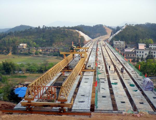 站塘大橋的中心樁號為K1497+532,全長306米,共12跨,是我標(biāo)段最長的一座大橋。上部構(gòu)造為25米預(yù)應(yīng)力箱梁,共96片,下部結(jié)構(gòu)共有樁基52根、蓋梁26片。站塘大橋的梁板是從2號梁場運(yùn)過來的。在運(yùn)梁過程中,由于遇到連陰雨天氣,導(dǎo)致道路潮濕,不能承受梁板的重量。針對這種情況,項(xiàng)目部積極開拓思路想辦法,不等不靠,通過用碎沙石鋪出一條道路來保證運(yùn)梁不受影響。在春節(jié)復(fù)工后,項(xiàng)目部又加大人力物力投入。架梁過程中,橋梁技術(shù)人員始終堅(jiān)守在施工一線,做好分部分項(xiàng)技術(shù)交底和安全防護(hù)工作,保證了架梁的進(jìn)度、質(zhì)量和安全。